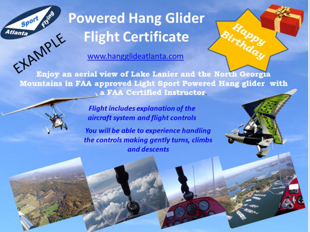 in a Powered Hang Glider Home Flights/Prices Videos The Aircraft The Pilot Directions Contact Learn to Fly &                                  Hang Glide Atlanta                                  North Georgia